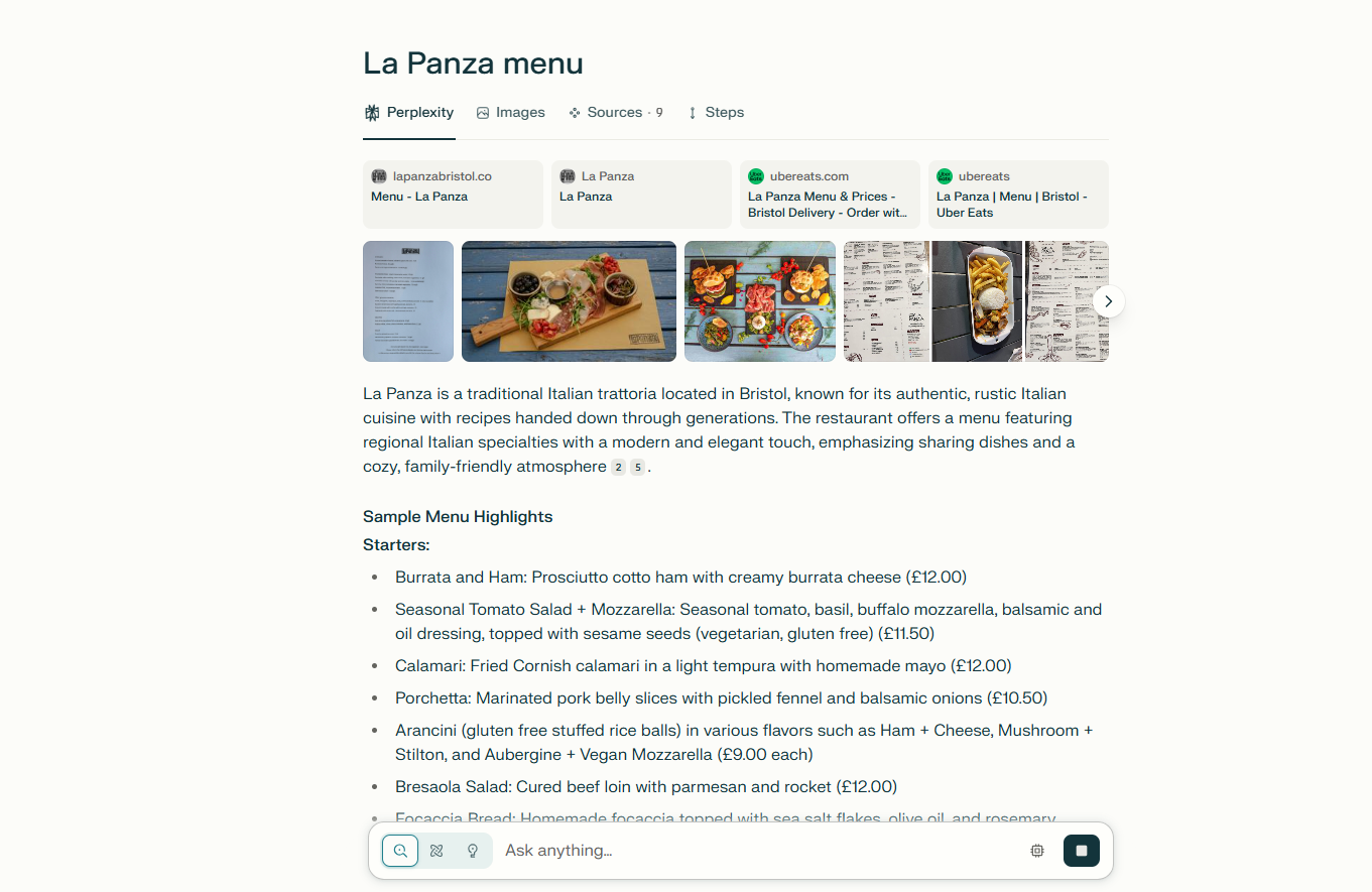 Despite this, Perplexity gave me a broken-down list of all of the starters, mains and desserts, as well as giving a description of the vibe of the restaurant, its accessibility and a rough guide to its pricing.
