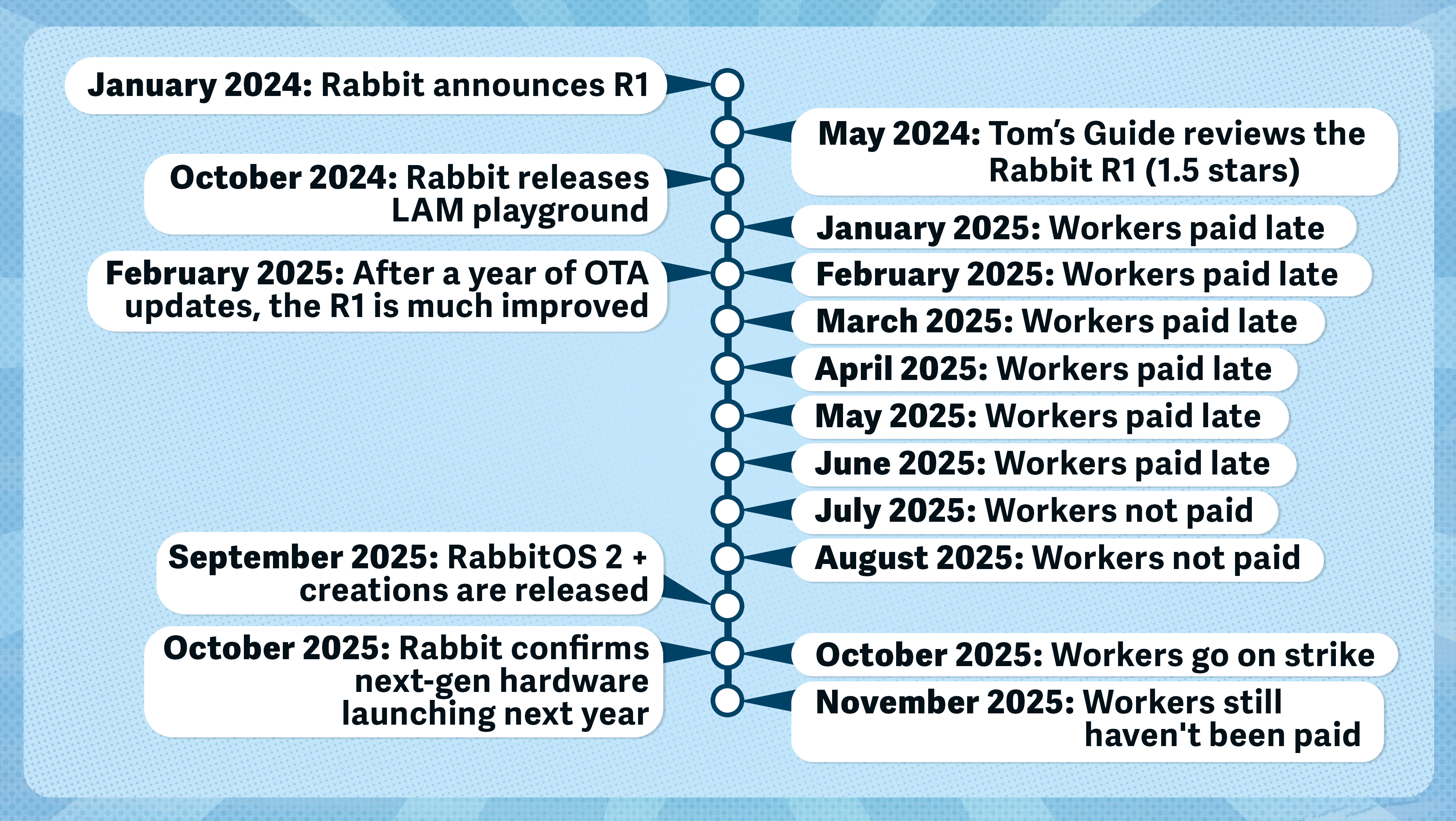 - Rabbit Inc. has been delayed in paying contractors and employees since the beginning of this year. Payroll, since January 2025, has been at least eight days late on being paid out each month. In one instance, payment was 37 days late.