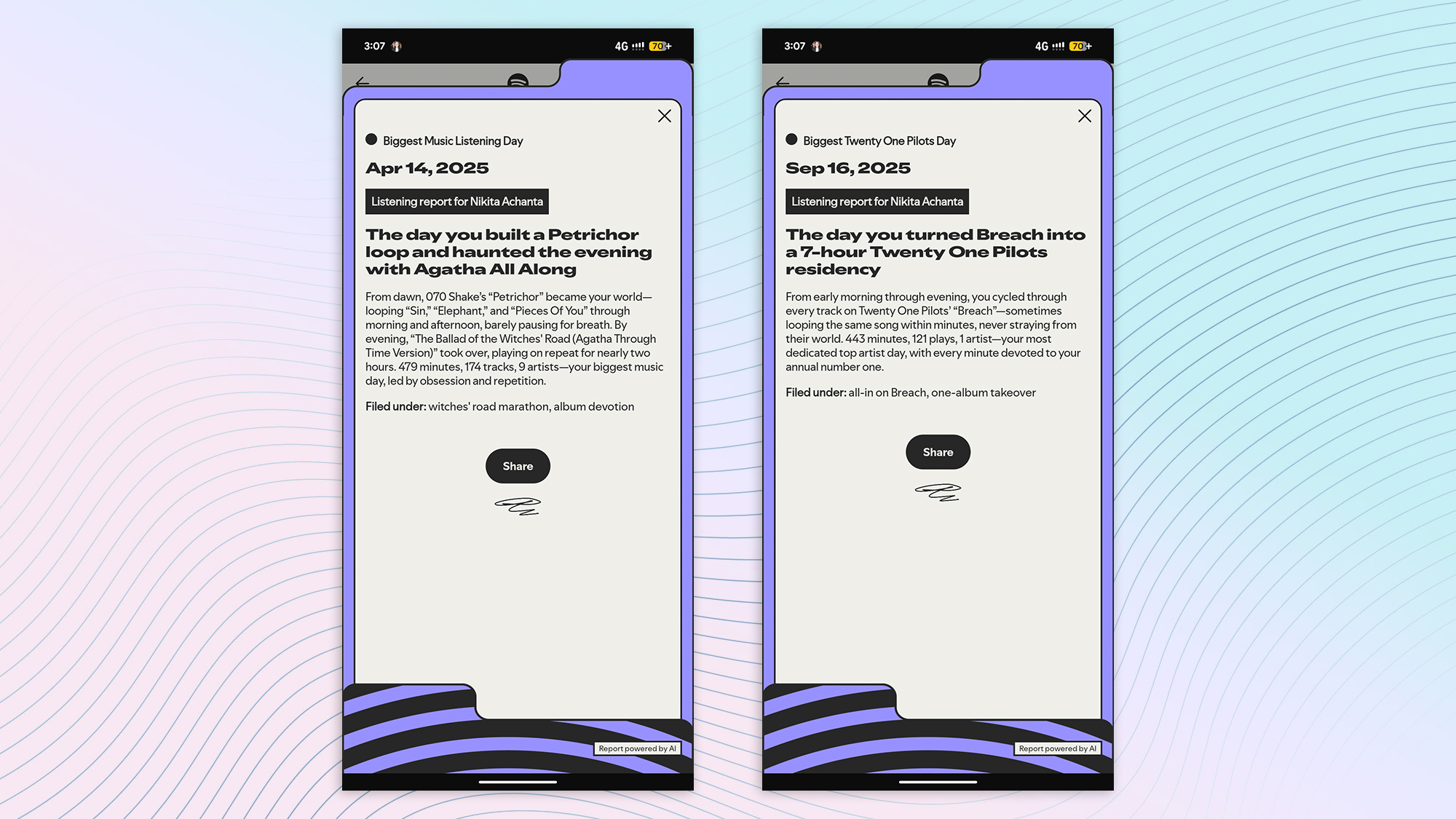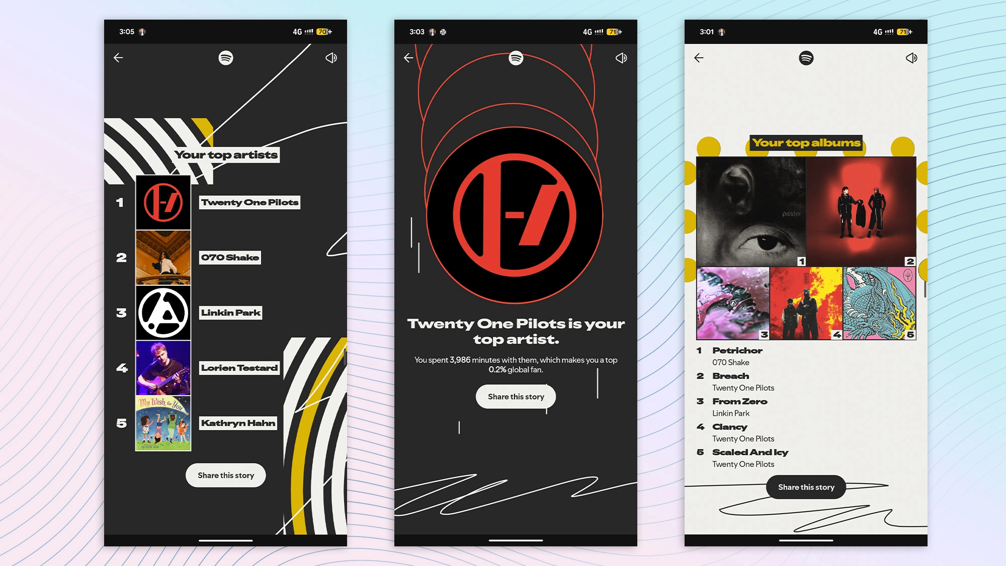 Spotify Wrapped 2024 felt a little lackluster as its "AI-powered" stats felt gimmicky and pretentious, and I'm glad the 2025 version has rectified that. I actually enjoyed the interactive bit of Wrapped 2025, where it gave me (and all of us) details about my "Biggest Twenty One Pilots Day" and "Biggest Music Listening Day."