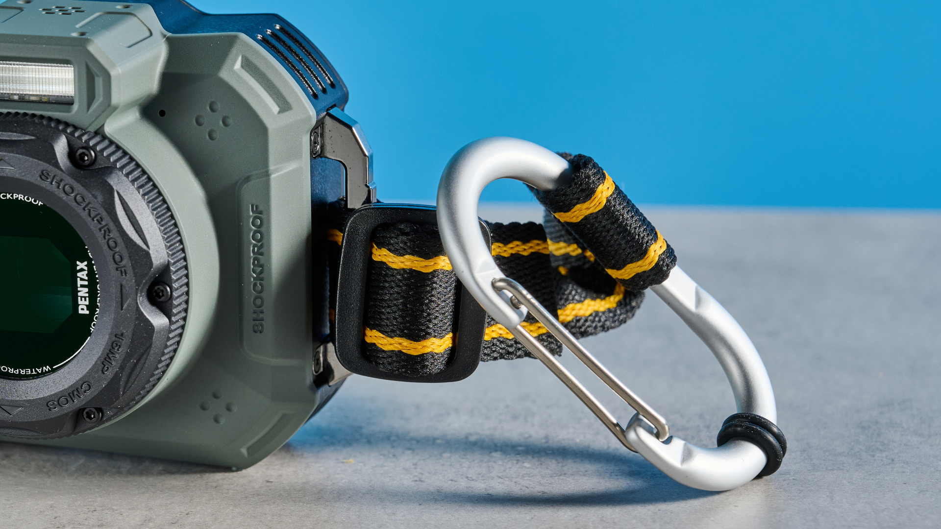 If you want to avoid dropping altogether, there are metal hooks on either side of the camera for two-point suspension, but a neck strap is not included. You do however get a carabiner strap to fasten it to the side of your bag for a hands free advantage, and a wrist strap to further negate any fumbles.
