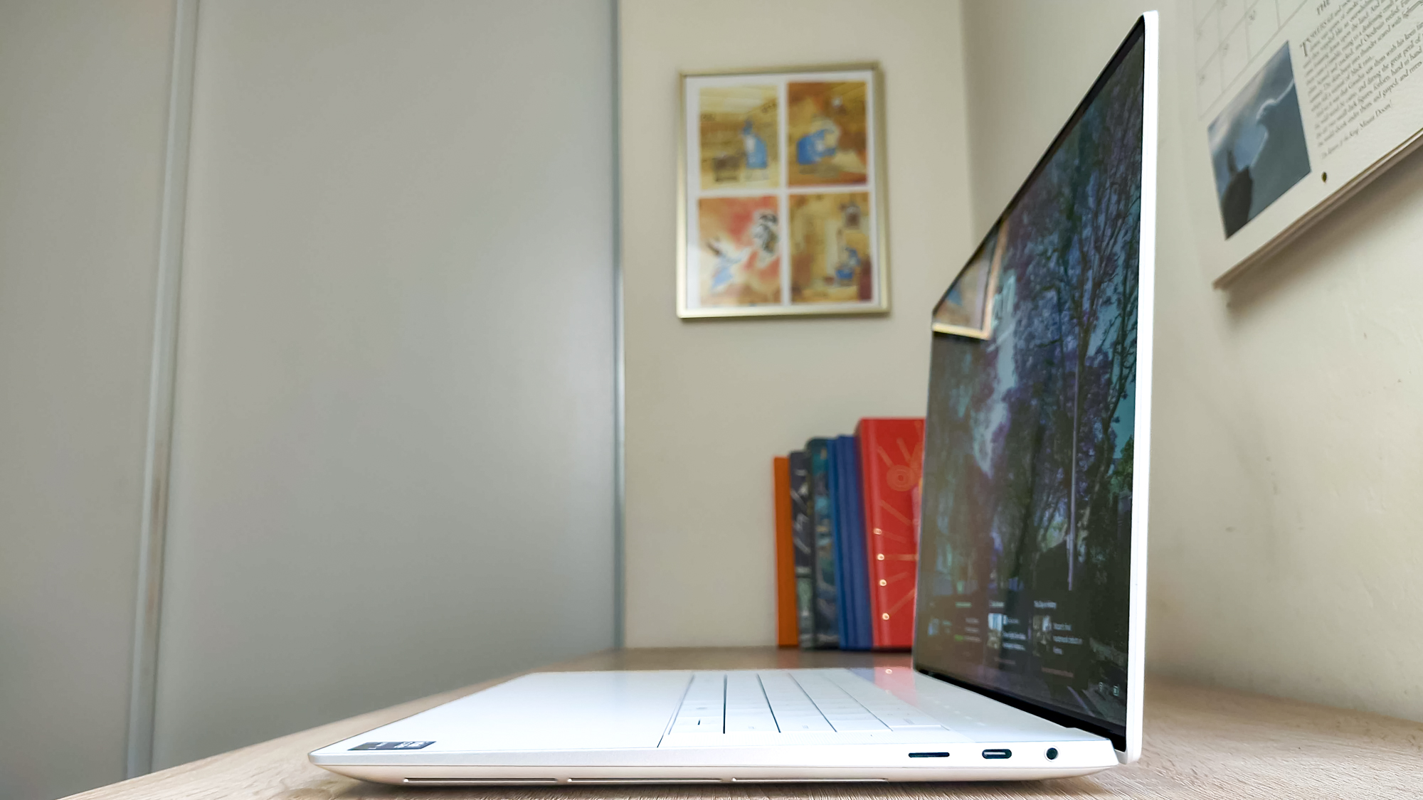 And when you open up our review unit (decked out in the Platinum color scheme) the remarkably thin bezels help emphasize the 16.3-inch display, making it seem to almost float in the air. And while I wish there was a little more lip at the top of the screen to make it easier to open with one hand, the Dell 16 Premium's lid is cut at an angle that makes it fairly easy to flip open with a finger.