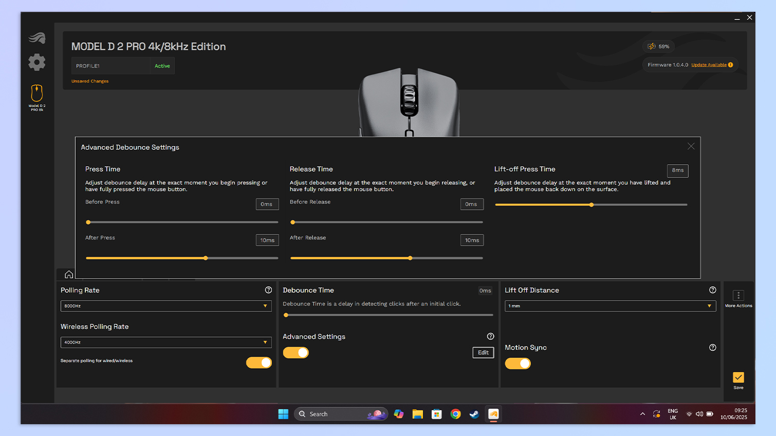 Here, I could quickly set two different polling rates for wired (up to 8,000Hz) and wireless (up to 4,000Hz), assign different values to the dedicated DPI button, adjust the advanced debounce settings and more. The Model D2 Pro’s internal memory can also store up to three custom profiles.