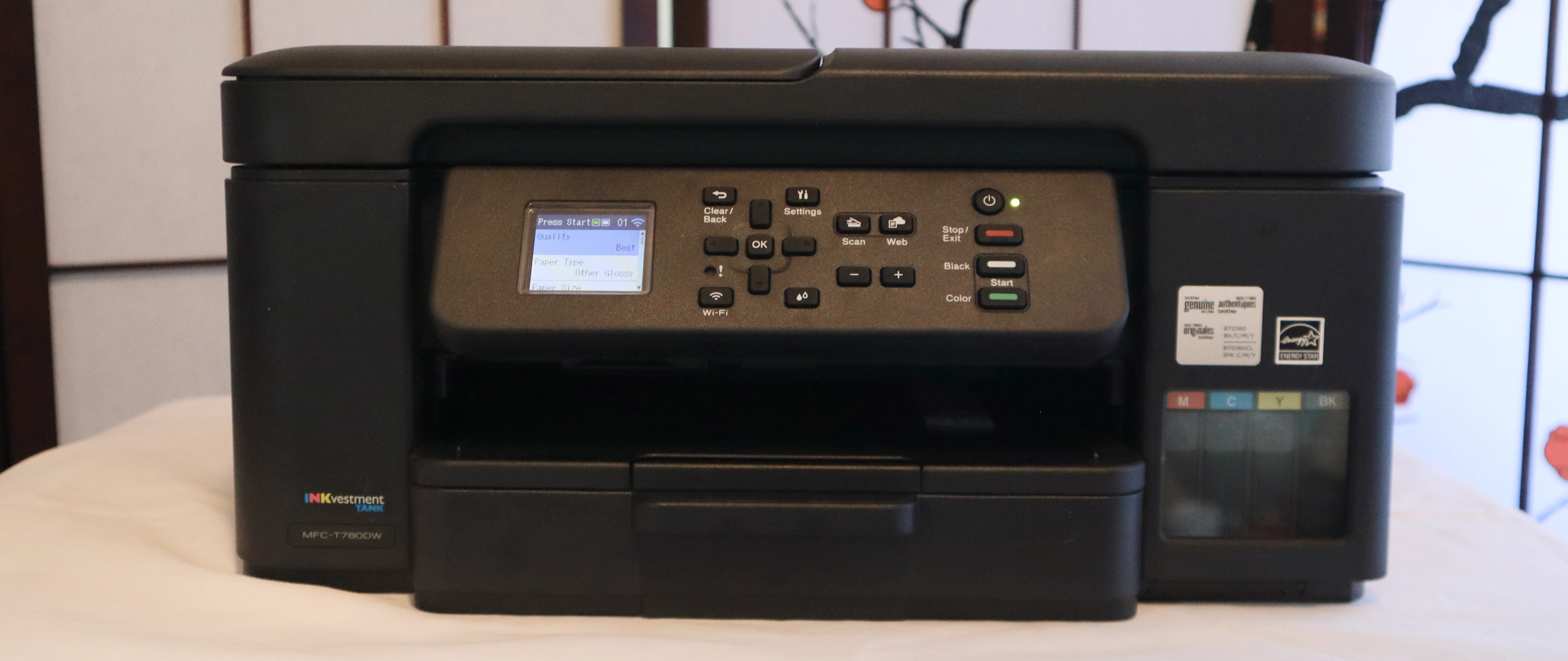 The T780DW starts up quickly, offering its main menu in just 4 to 5 seconds. However, I couldn’t navigate the menus until about 18 seconds had passed. That’s still very quick. However, I ran into a frustrating anomaly: Even though I had reset the paper type to plain paper, upon restarting the printer, its paper type had reverted to “other glossy”, the setting I’d changed it from.