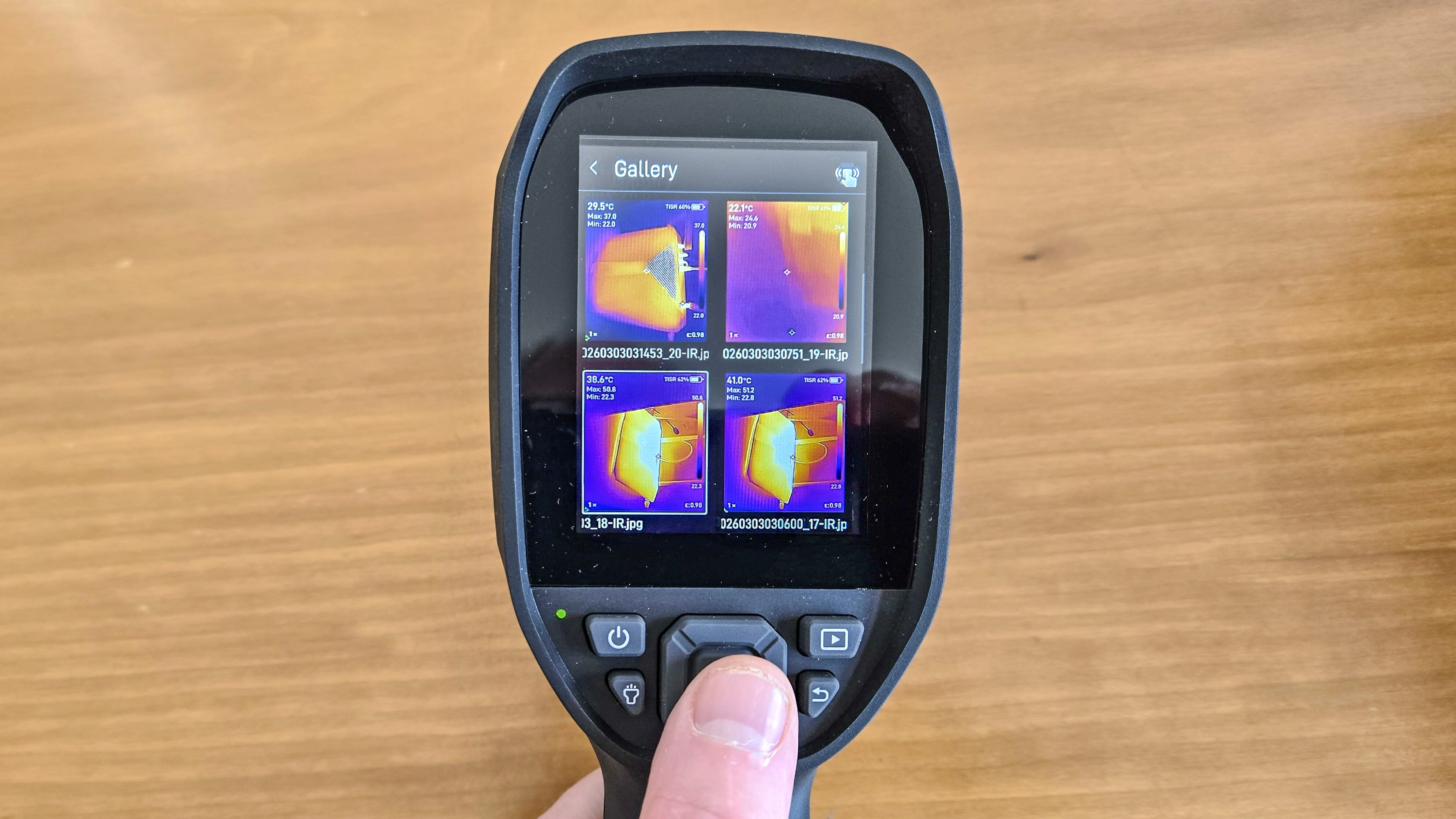 At any time, I can snap a screenshot or shoot video that’s saved on its 64GB of internal storage. They end up in the TC004’s gallery showing four thumbnails at a time. The files can easily be moved on to my computer with the included USB-C cable. Topdon also has Windows transfer software (sorry, no Mac software yet) as well as the TopInfared app for Android and iOS that connects over Wi-Fi to deliver a live view as well as access and synchronize the stored files.