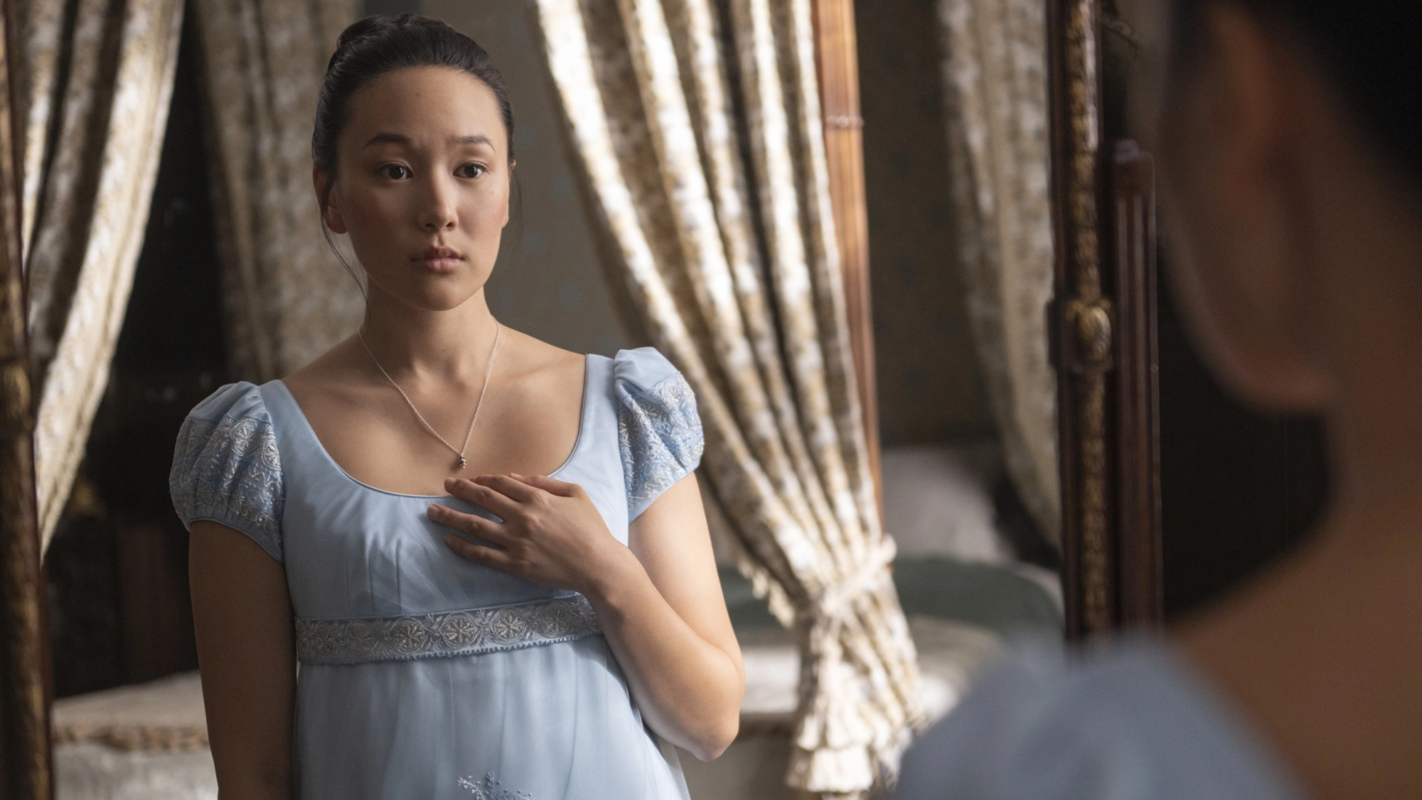 Benedict seems happily committed to his non-committal rakishness — that is, until he catches sight of the Lady in Silver at his mother’s masquerade ball, a mysterious woman gazing in awe upon the glittering chandelier that dominates the room. Her identity is largely masked by a lacy headpiece, but the Bridgerton lad is instantly taken by her in a way heretofore unachieved by the other eligible ladies of the Ton (who bear “no true animation, no zest for life, no personality,” Benny bemoans in one scene).