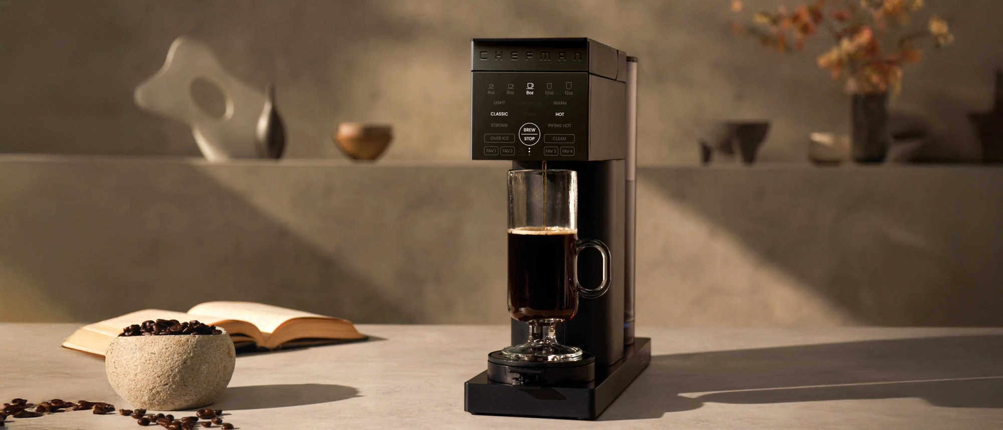 The Chefman Caffeinator currently retails at $129.99 on Amazon, and also available at Walmart, Kohl’s, Costco, and Best Buy, as well as Chefman’s website. The machine comes in two color choices: Midnight, a classic black, and Concrete, a stylish matte off-white.