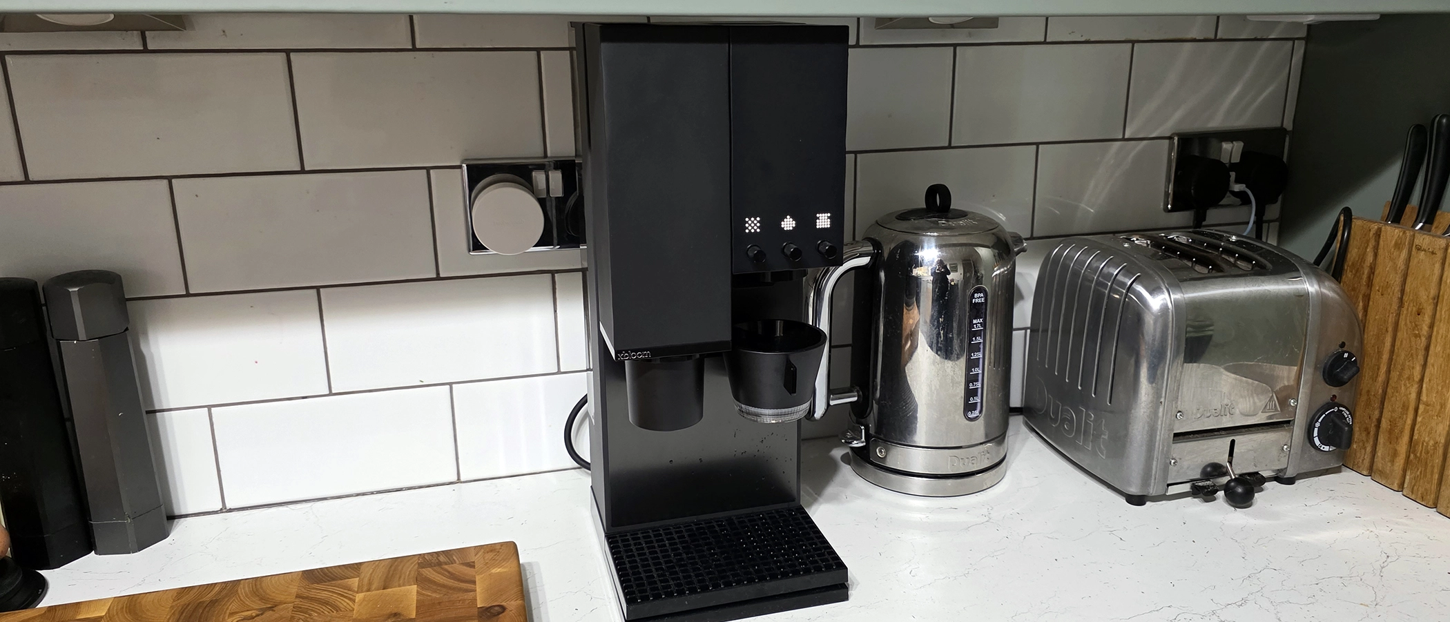 It has a blocky design (similar to the Fellow Aiden with sharp, squared-off edges) and sits discreetly on countertops. It takes up about the same amount of space as an electric kettle, which, for a machine that can grind and brew coffee, is pretty impressive.