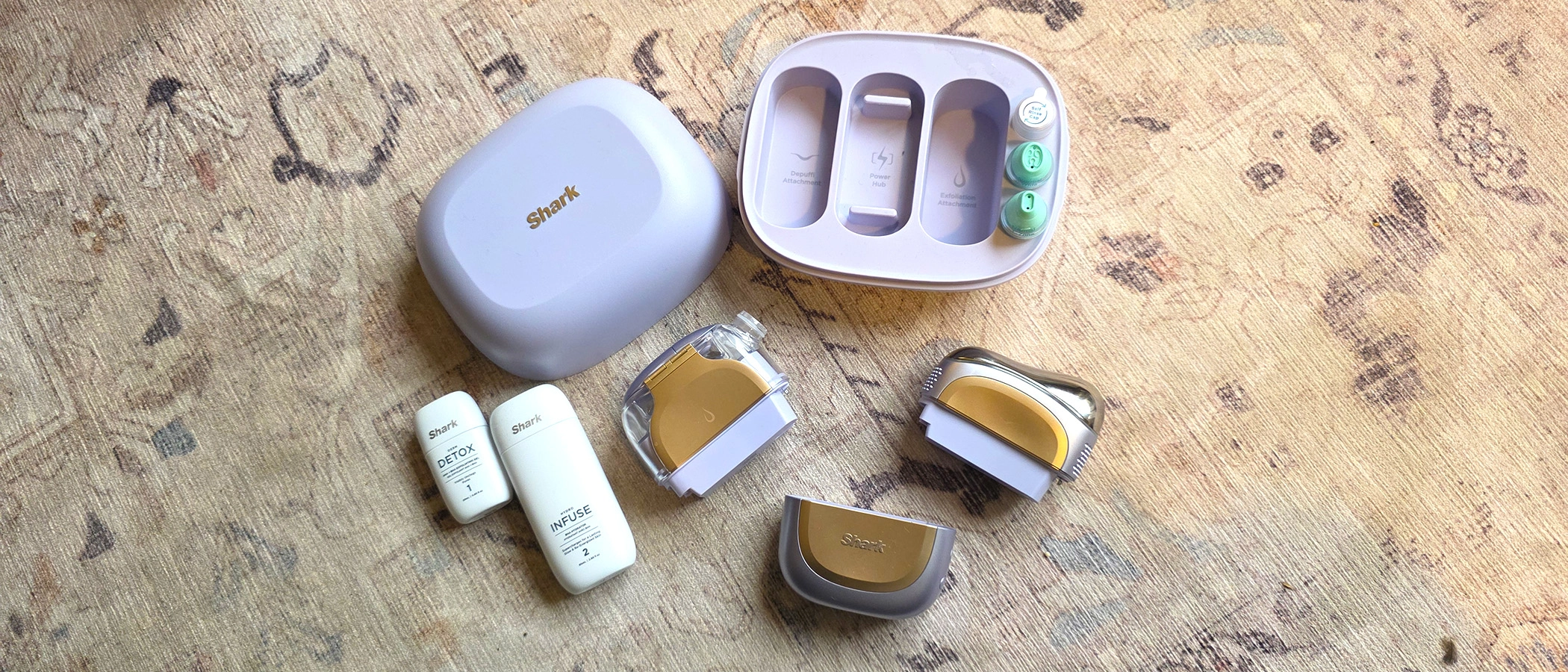 In the box: Power hub, travel case, Depuffi attachment, Exfoliation attachment with wide and T-zone tip