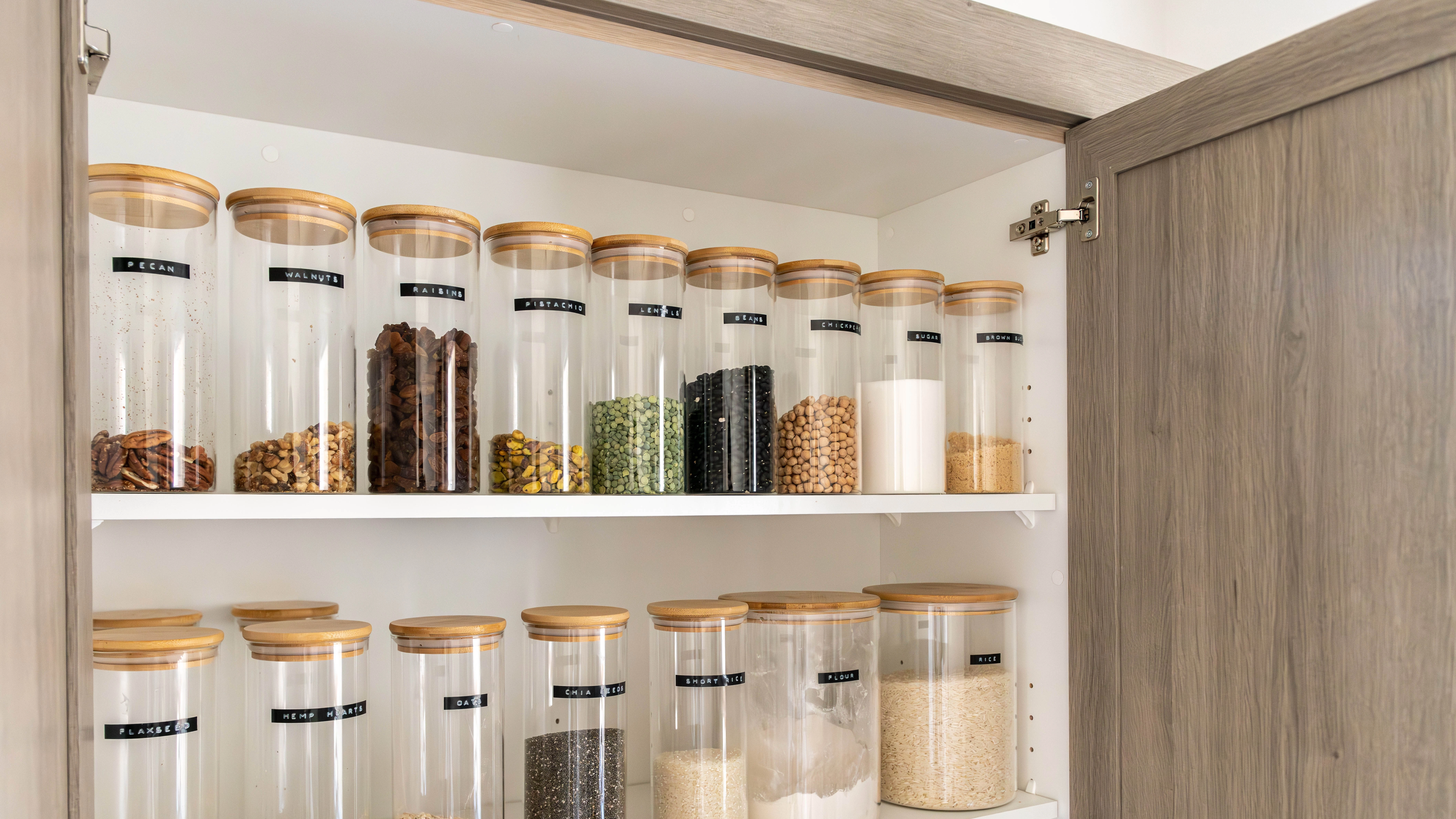 Many items on your pantry shelves look similar, which can waste time sorting through what you need. Decanting food items into containers and then labeling them clearly will often save space and make it quicker to retrieve what you need. So, when you’re making a loaf of bread, you’ll be able to locate your bread flour instantly, without picking up self-rising or all-purpose flour by mistake.