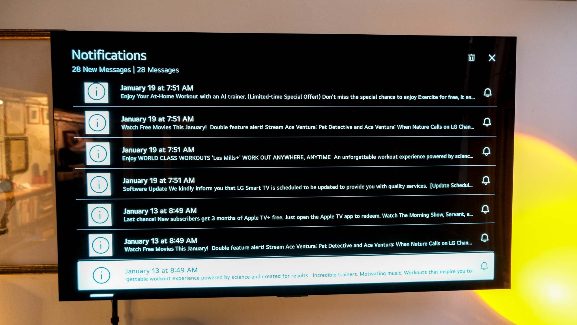 These notifications aren't for anything important like software updates. No, they're much more frivolous. Like the message that I just got spammed with to "Enjoy Your At-Home Workout with an AI trailer. (Limited-time Special Offer!)", or messages about the random free movies that LG's offering (sorry, Ace Ventura, I'm not picking up, even When Nature Calls).