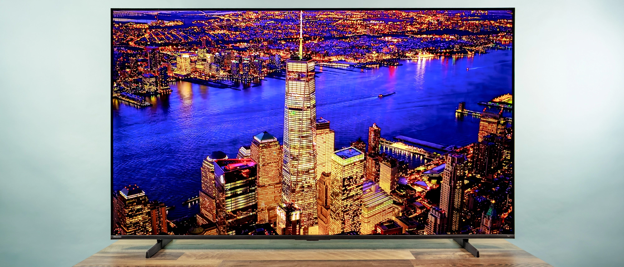The Hisense QD7 is virtually all screen, save for a slim bezel measuring about 8mm on the top and sides. A 15mm strip on the bottom is empty, save for a barely legible "Hisense" in the lower-left corner.