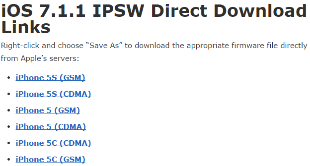 Step 1. Download the iOS 7.1.2 version that corresponds to your device and save it to an easy-to-find place like the desktop. You can find the right firmware for your device from this list via OSX Daily.
