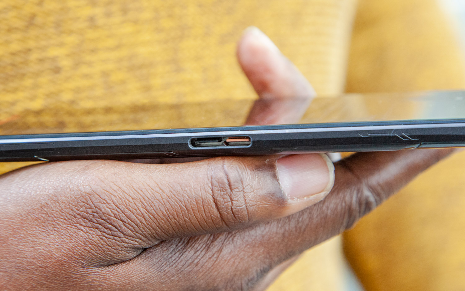 Slightly raised, the power button and volume rocker reside on the right. On the bottom, there's another USB Type-C and a 3.5 millimeter audio jack.
