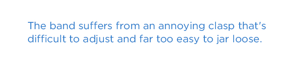 While attractive and comfortable, the band suffers from an annoying clasp that's difficult to adjust and far too easy to jar loose. Rather than using a buckle like most leather bands in the world, this one forces you to move a metal peg to adjust its width — a process I found both frustrating and time consuming because pushing the peg in requires some force.