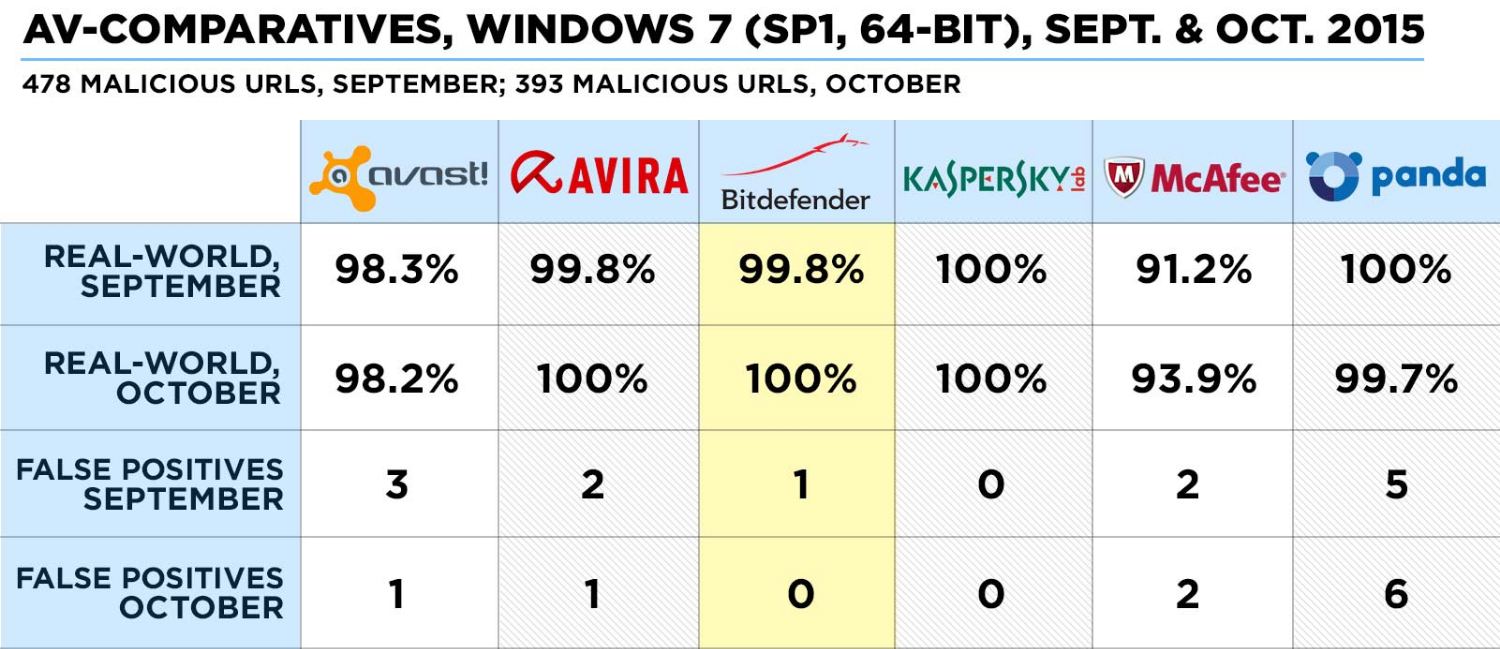 But it was beaten by Kaspersky and Panda's perfect scores. In October, the tables were turned — Bitdefender joined Avira and Kaspersky in finding and blocking everything thrown at it, while Panda slipped to 99.7 percent.