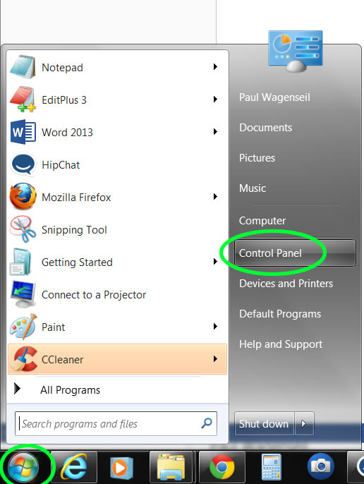 1. Open the Windows control panel. In Windows 7, Vista or XP, click the Start button at the bottom left of the screen and select Control Panel in the pop-up menu.
