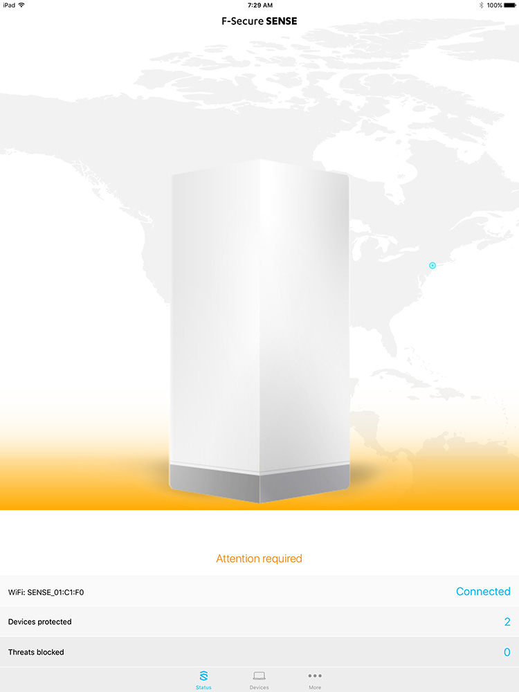 Beneath is a notation that "Everything is OK" in green or "Attention Required" in yellow. The screen shows the network's name, number of devices online and how many threats Sense blocked as well as providing links to Devices for a list of connected clients. Click on any to see details like IP and Mac addresses or block the internet for this device; unfortunately, you can't turn off the internet for all devices at once for family time, dinner or movie night.