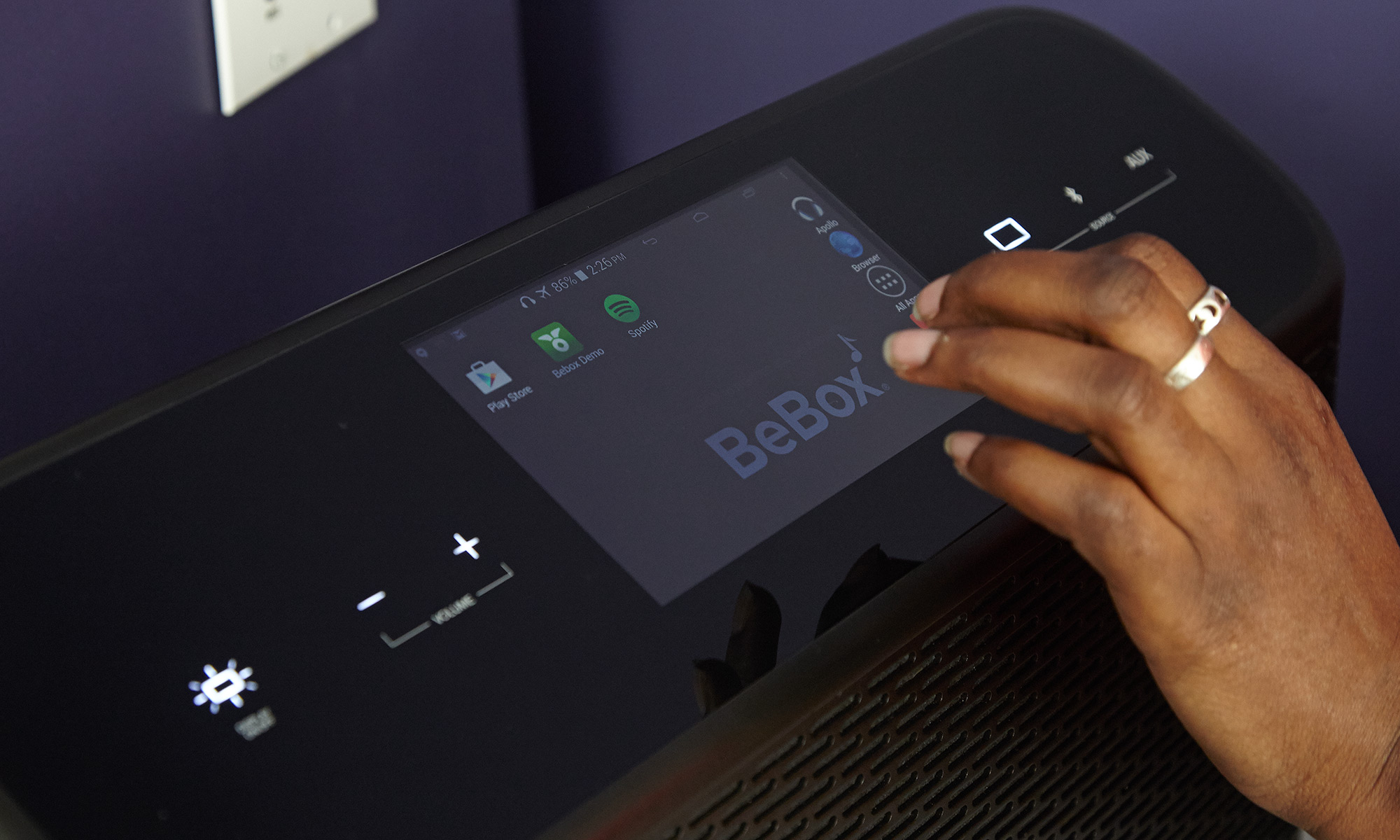 With the speaker powered on, a section of the seemingly solid black surface lights up to reveal a 7-inch, 1024 x 600 capacitive display ready to put you in touch with your music. The screen is a veritable fingerprint magnet, becoming a smudged mess in a matter of seconds. Good thing the BeBox ships with a cleaning cloth to maintain that new gadget shine.