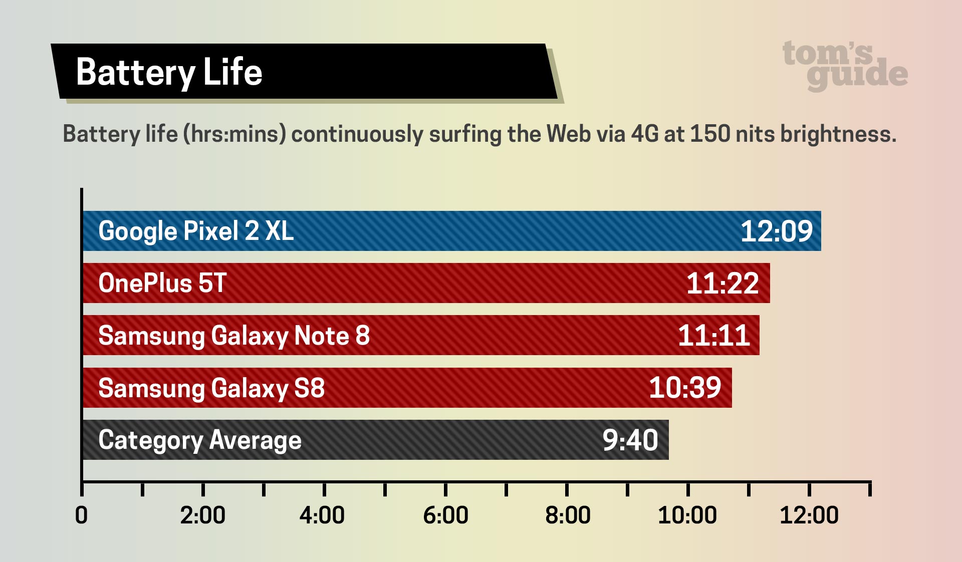 Not surprisingly, the Pixel used its larger capacity to stretch its longevity about an hour past the Note 8 on a single charge. Where Samsung's device called it quits at 11 hours and 11 minutes, Google's phone lasted for 12 hours and 9 minutes before needing a refill.