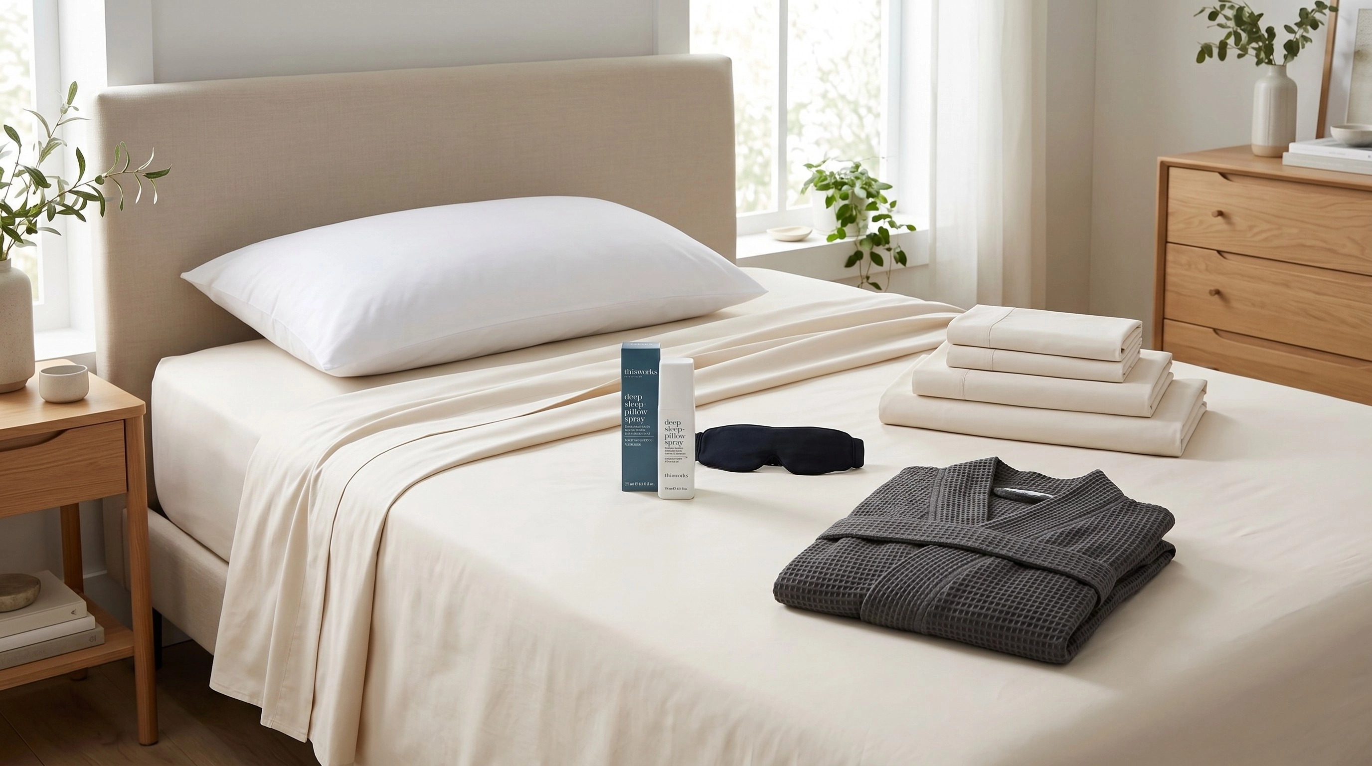 Opting for pajamas and robes made from breathable natural materials can prep your body for sleep by helping lower your core temperature, while an organic eye mask blocks out disruptive lights. Finish with a spritz of lavender pillow spray for a greener bedtime routine.